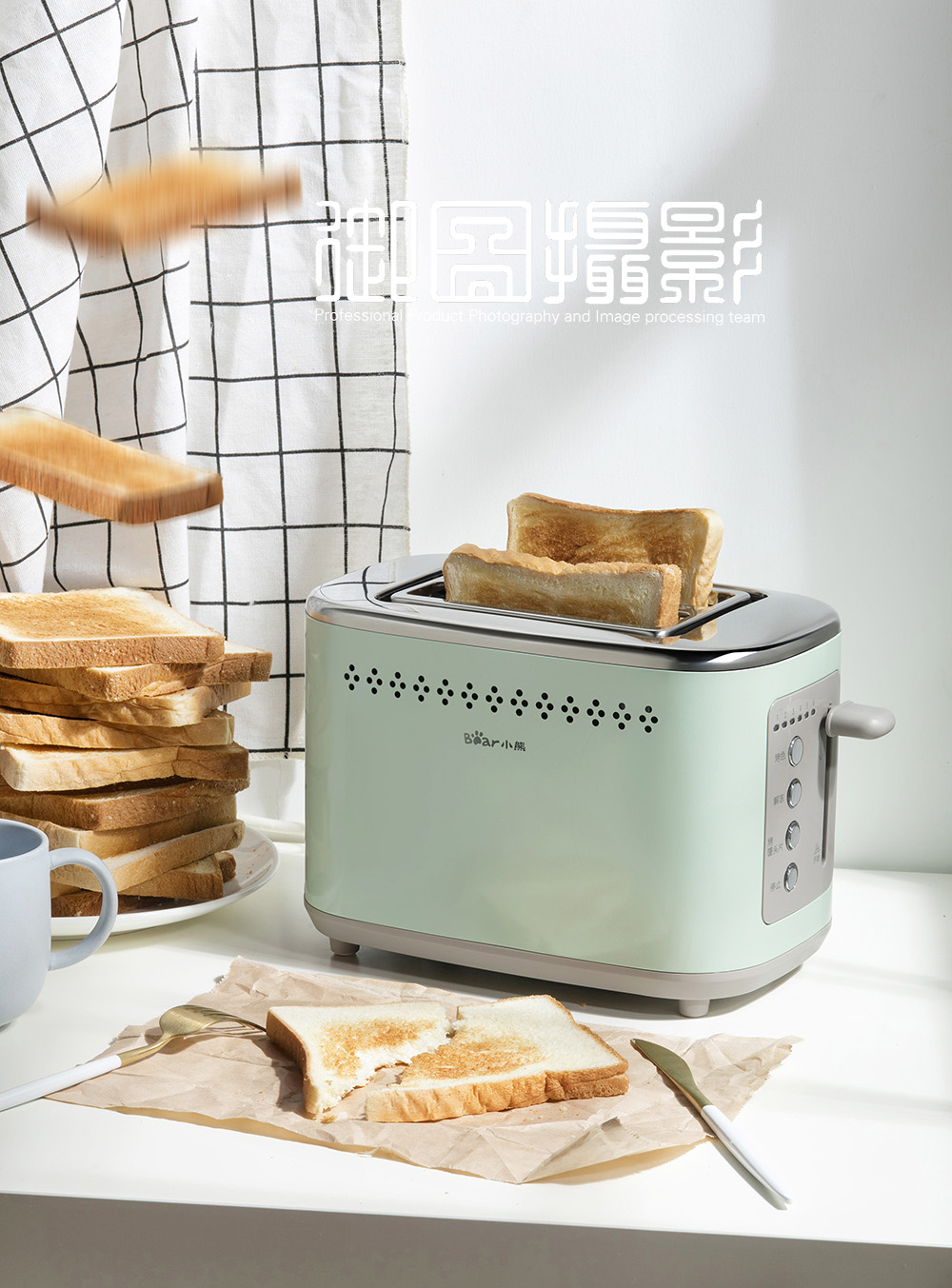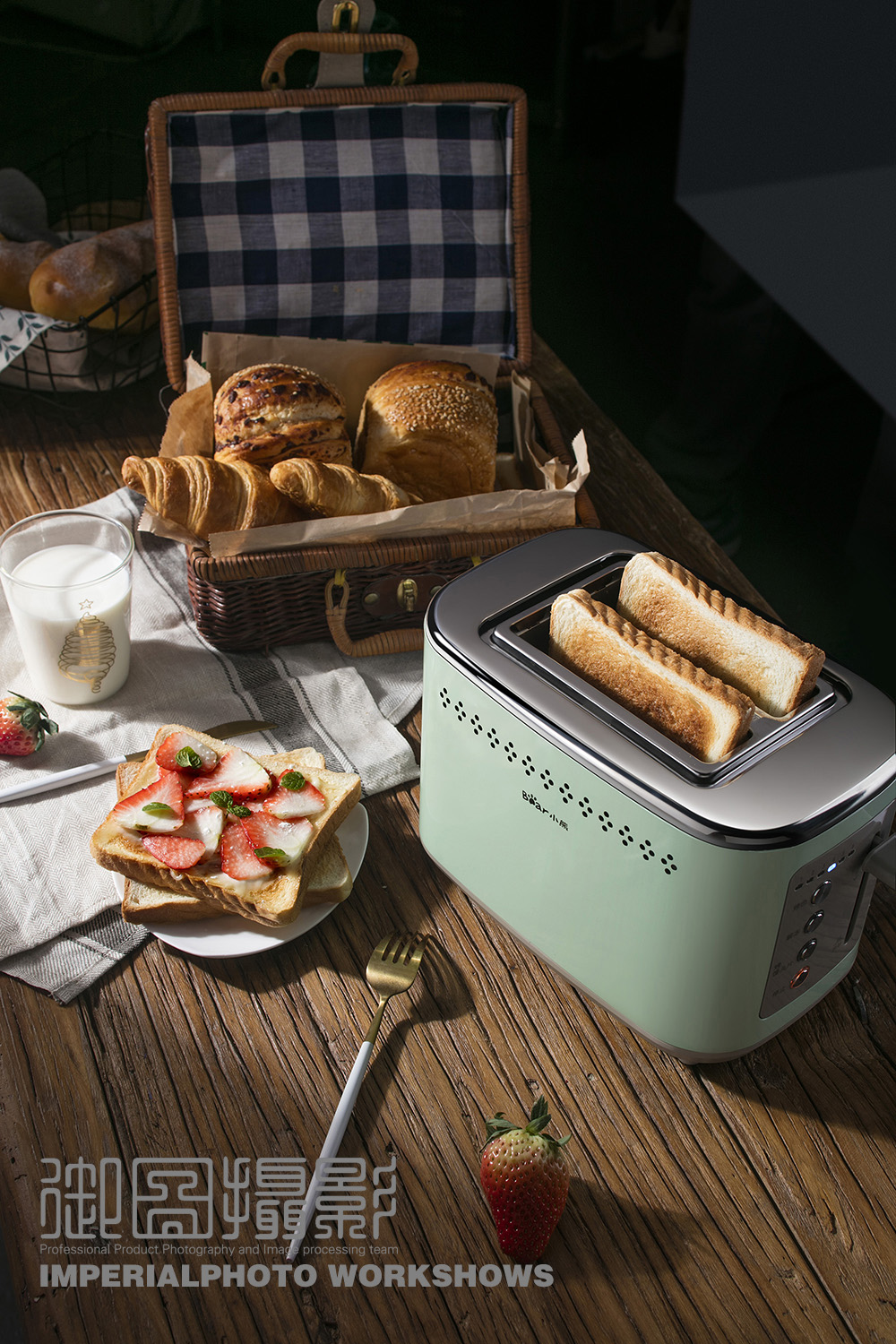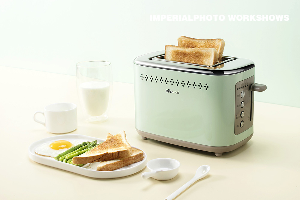 拍攝場景圖的時候用(yòng)最多(duō)的是左右光,強調産(chǎn)品的明暗的對比,或者是前後光,讓産(chǎn)品的表現更融進實景中(zhōng)去。尤其是拍攝帶有(yǒu)食物(wù)的小(xiǎo)家電(diàn)圖,後面打光過來食物(wù)會更有(yǒu)光感,挑起人的食欲。